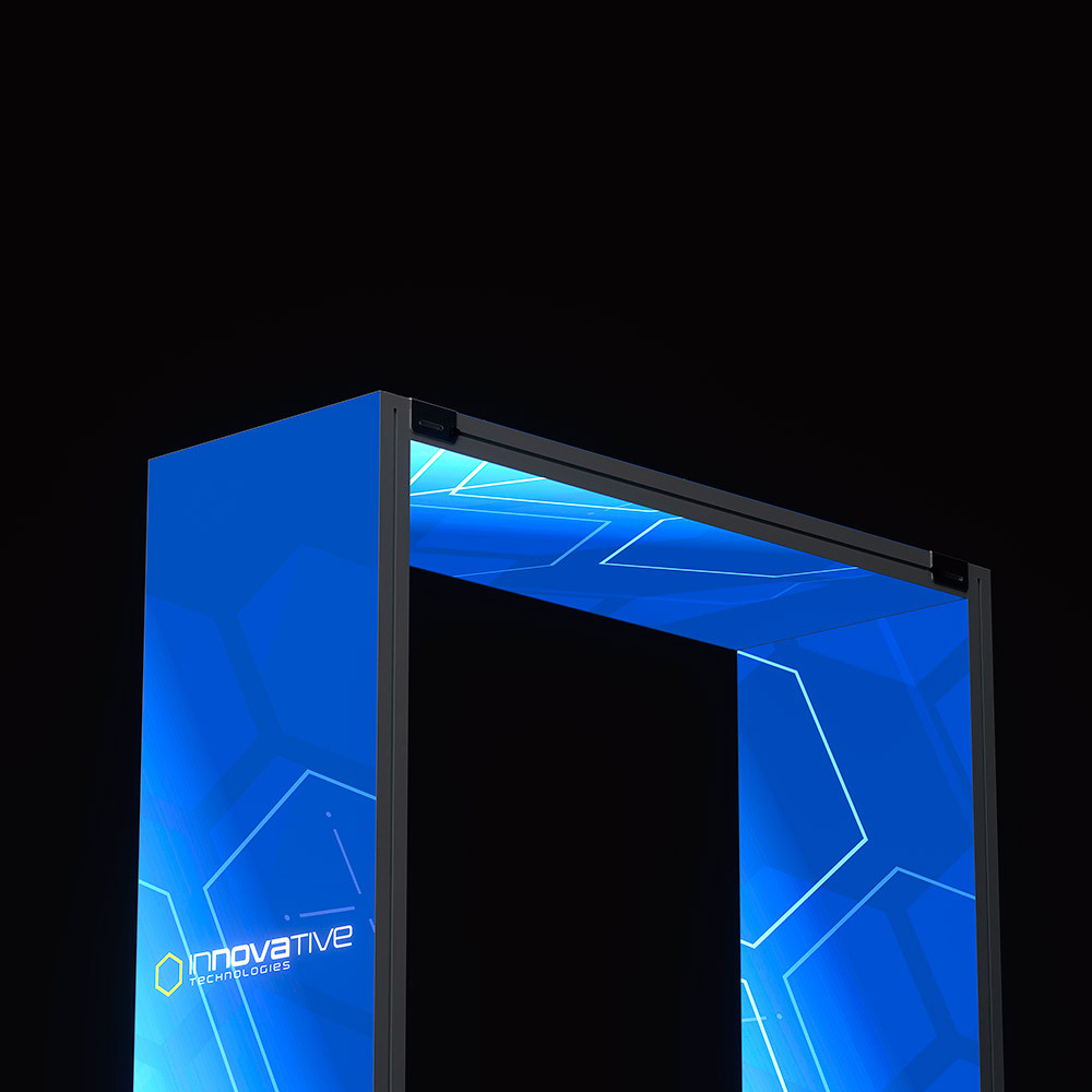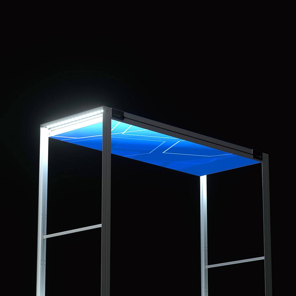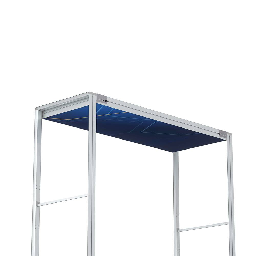 Doplňte svoj stánok výrazným prvkom - strechou Brightbox Pro Flex. Urobí dojem zhora vďaka elegantnému podsvietenému rámu v striebornej farbe. Súčasťou sú spojky na jednoduché upevnenie k stenám. Dodáva sa s mäkkou prenosnou taškou - ideálna pre veľtrhy a akcie.- Dodajte svojmu stánku profesionálny vzhľad so strechou