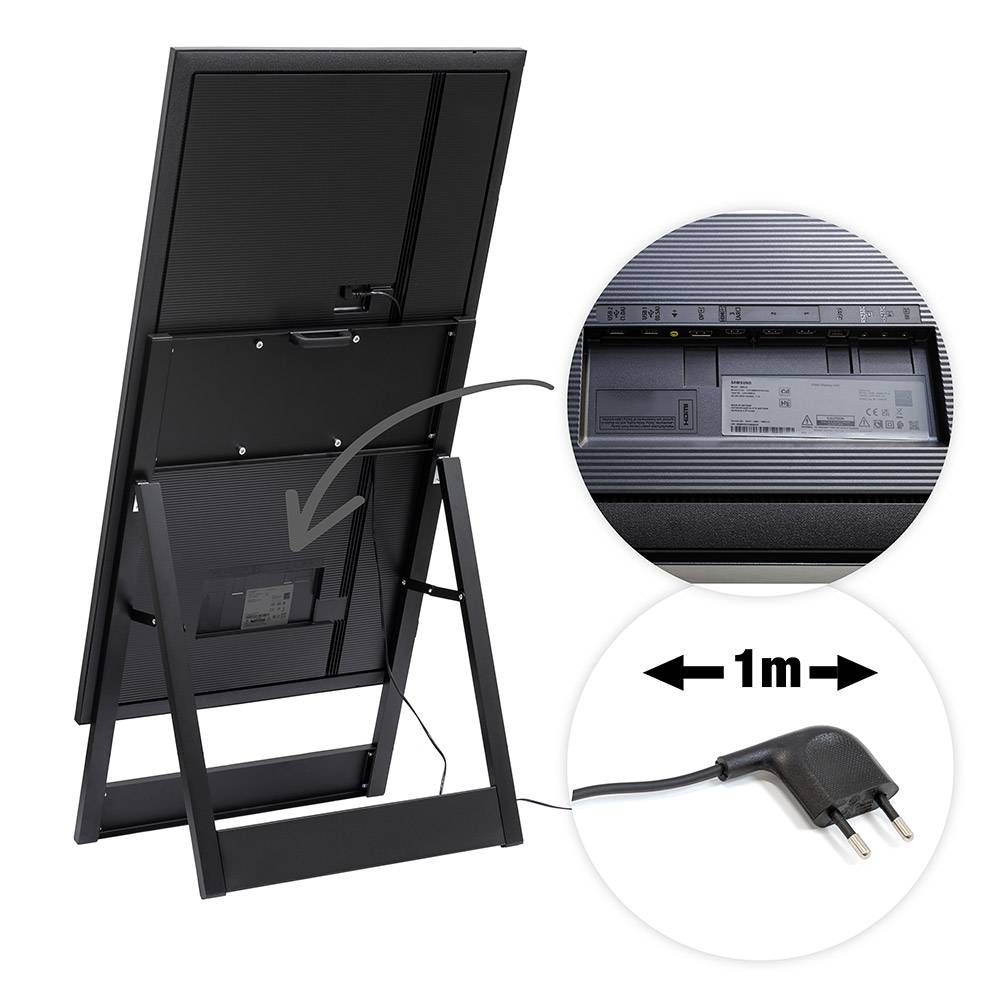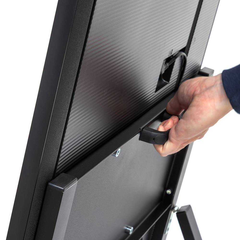 Prezentujte svoj digitálny obsah s digitálnym áčkom Easel. Vďaka elegantnému čiernemu hliníkovému rámu s profilom 40×20 mm (ŠxH) doplnenému o oceľové komponenty ponúka konštrukciu s dokonalou stabilitou. Voľne stojace prevedenie umožňuje flexibilné umiestnenie a jednoduchú montáž. VESA držiak môže niesť 43 "alebo 55" obrazovku Samsung QMC. Obsah môžete prehrávať 24/7 jednoducho cez USB, alebo zariadenie rozšíriť o plnohodnotnú správu obsahu Samsung VXT CMS.- Voľne stojaci stojan pre ľahkú prezentáciu