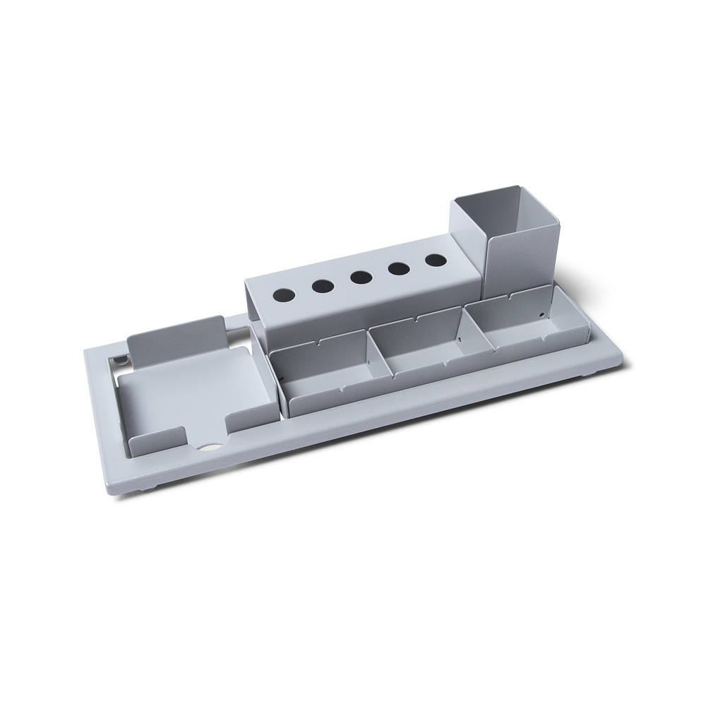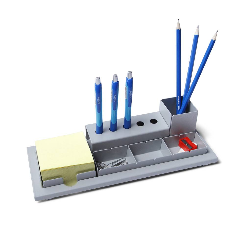 Kovový organizér na stôl pre vaše najpoužívanejšie kancelárske pomôcky. Praktický aj elegantný doplnok pre váš pracovný stôl. Pripravené časti pre ceruzky, poznámkové bločky i drobnosti ako sú napr. kancelárske sponky. Organizér vám bude na stole skvele držať vďaka gumovým protišmykovým nálepkám, a pretože sú jednotlivé sekcie vyberateľné, môžete ho ľahko vyčistiť.