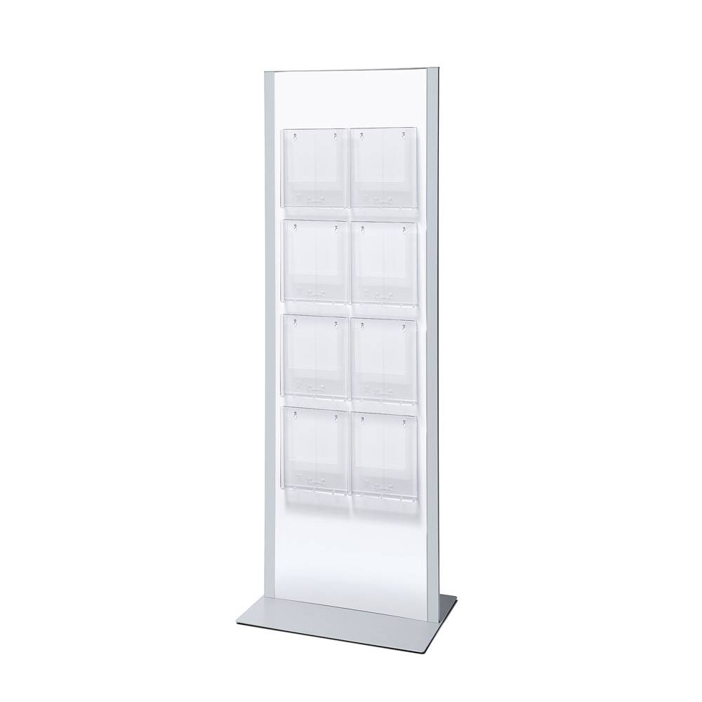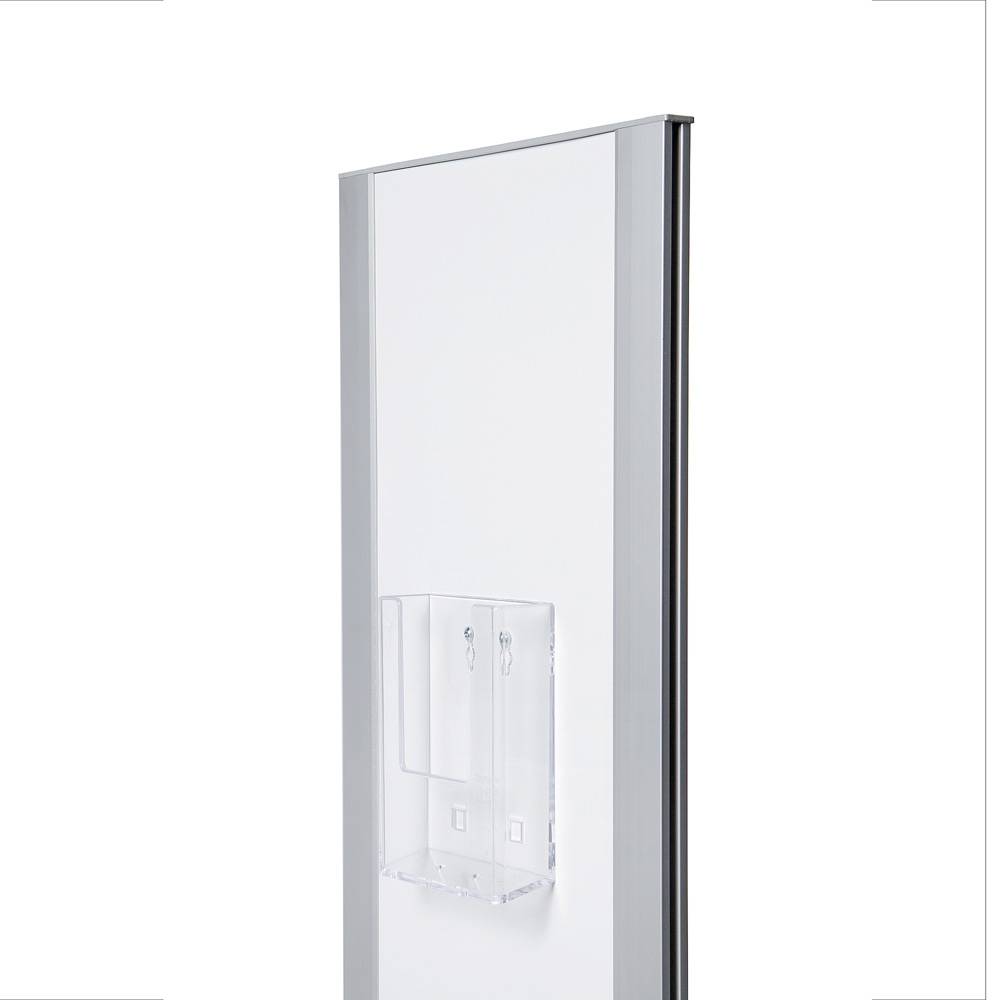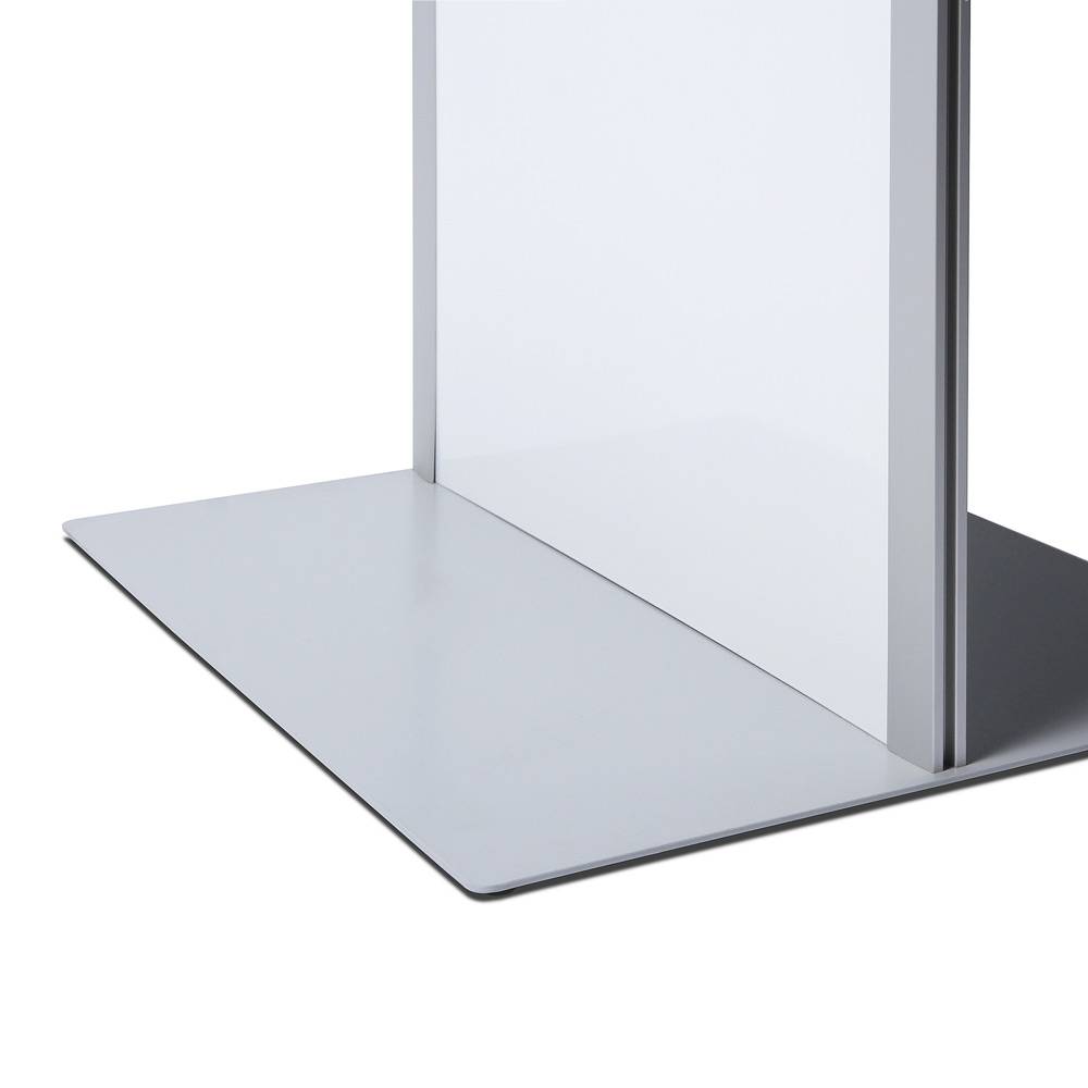 Ideálny totemový stojan na letáky pre kancelárie, showroomy a administratívne budovy. Na toteme je možné ľubovoľne kombinovať akrylové zásobníky na letáky aj klaprámy v štandarde. Multifunkčný stojan na letáky má veľmi moderné prevedenie, bočné strieborné profily sú vyrobené z eloxovaného hliníka a má práškovo lakovaný biely kovový centrálny panel, ktorý je vhodný pre potlač podľa vášho želania. Okrem vlastnej potlače je možné centrálny panel nafarbiť ostatnými farbami RAL na požiadanie.